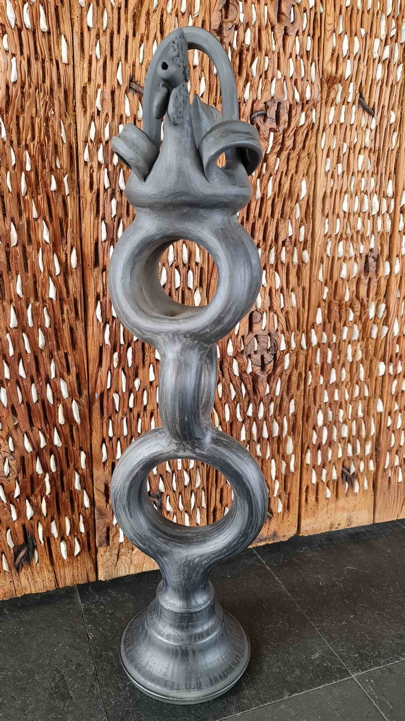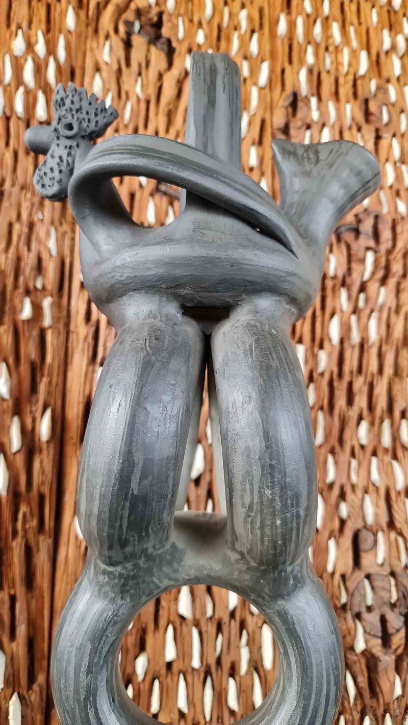 Botijo de cerámica negra de Llamas del Mouro con gallo y cuerpo de roscas, de muy dificil ejecución, y muchas horas de trabajo. Totalmente artesanal, oficio familiar desde varias generaciones.