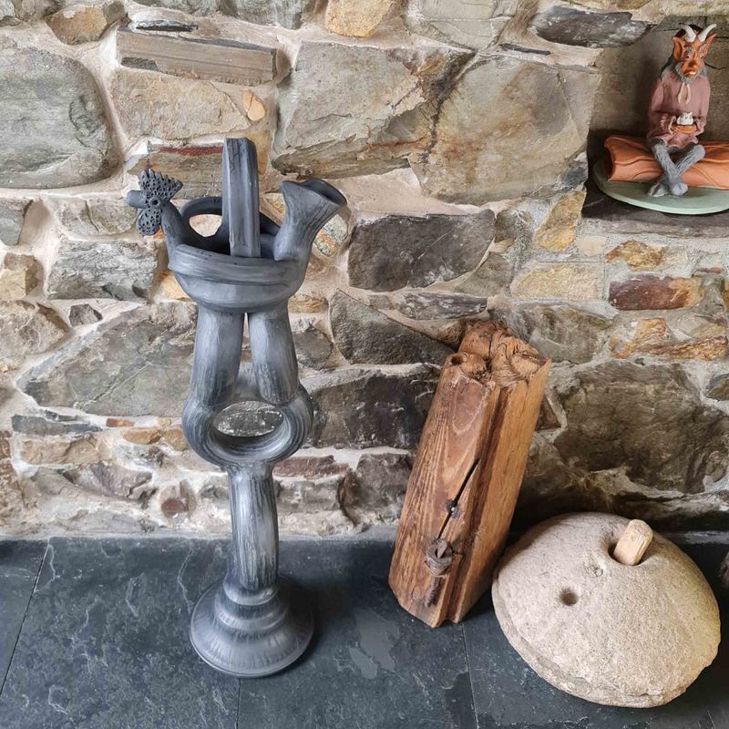 Cerámica negra de Llamas del Mouro en Asturias, cerámica excepcionalmente dura por su alta temperatura de cocción, donde se suprime el oxígeno para que el humo se adhiera a la pieza, color entre negro-gris y gris-metálico.
