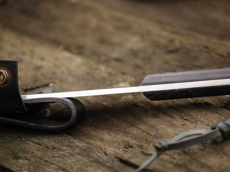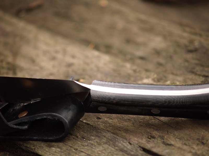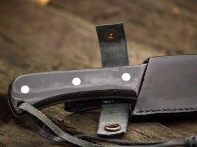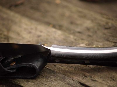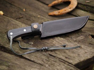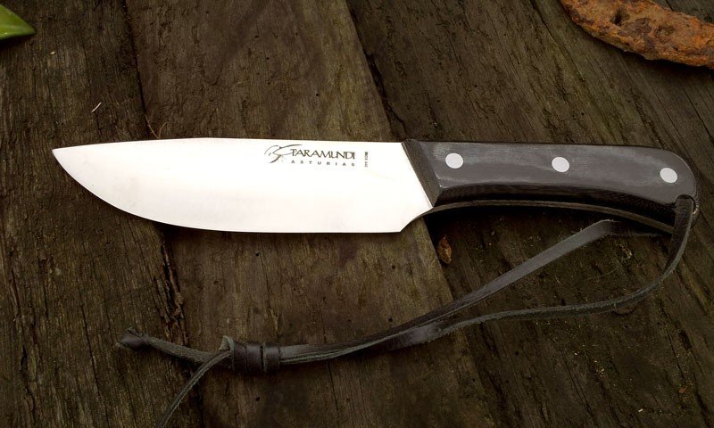 Cuchillo de monte o caza con funda de cuero negro, madera de Mikarta acabado natural, hoja enteriza de 14,5 cm. en acero 44o-C de gran dereza y corte, con un grosor de 4 mm. Fabricación artesanal. Fabricado el Taramundi.