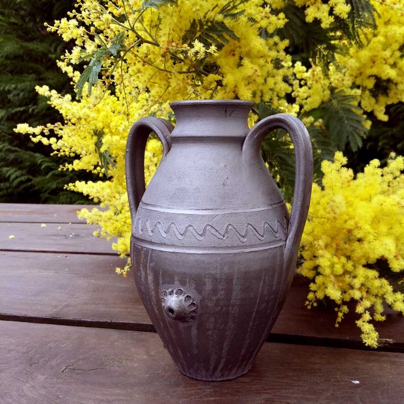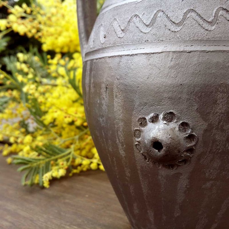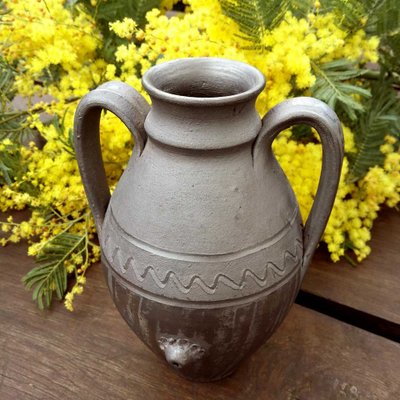 Utilizada para batir la nata y hacer mantequilla, con agujero para la salida del suero. Cerámica excepcionalmente dura y de color entre negro-gris y gris plata, y sonido metálico. Dimensiones aproximadas de la pieza: 24,5x18x15,5cm.