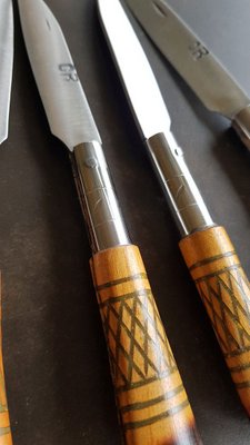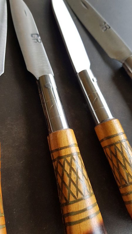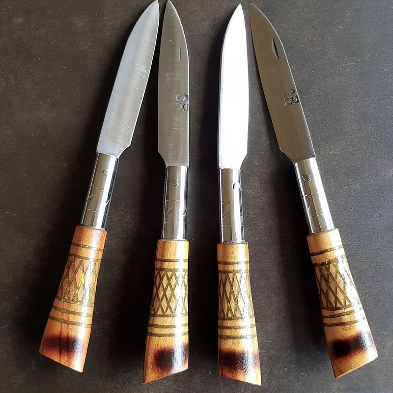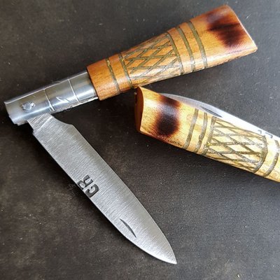 Navaja de Regodeseves, mango de boj decorado y quemado. Hoja inoxidable de 7 cm. Dimensiones aproximadas abierta 15,5x1,7x1,2 cm Cerrada 9x1,7x1,2 cm.