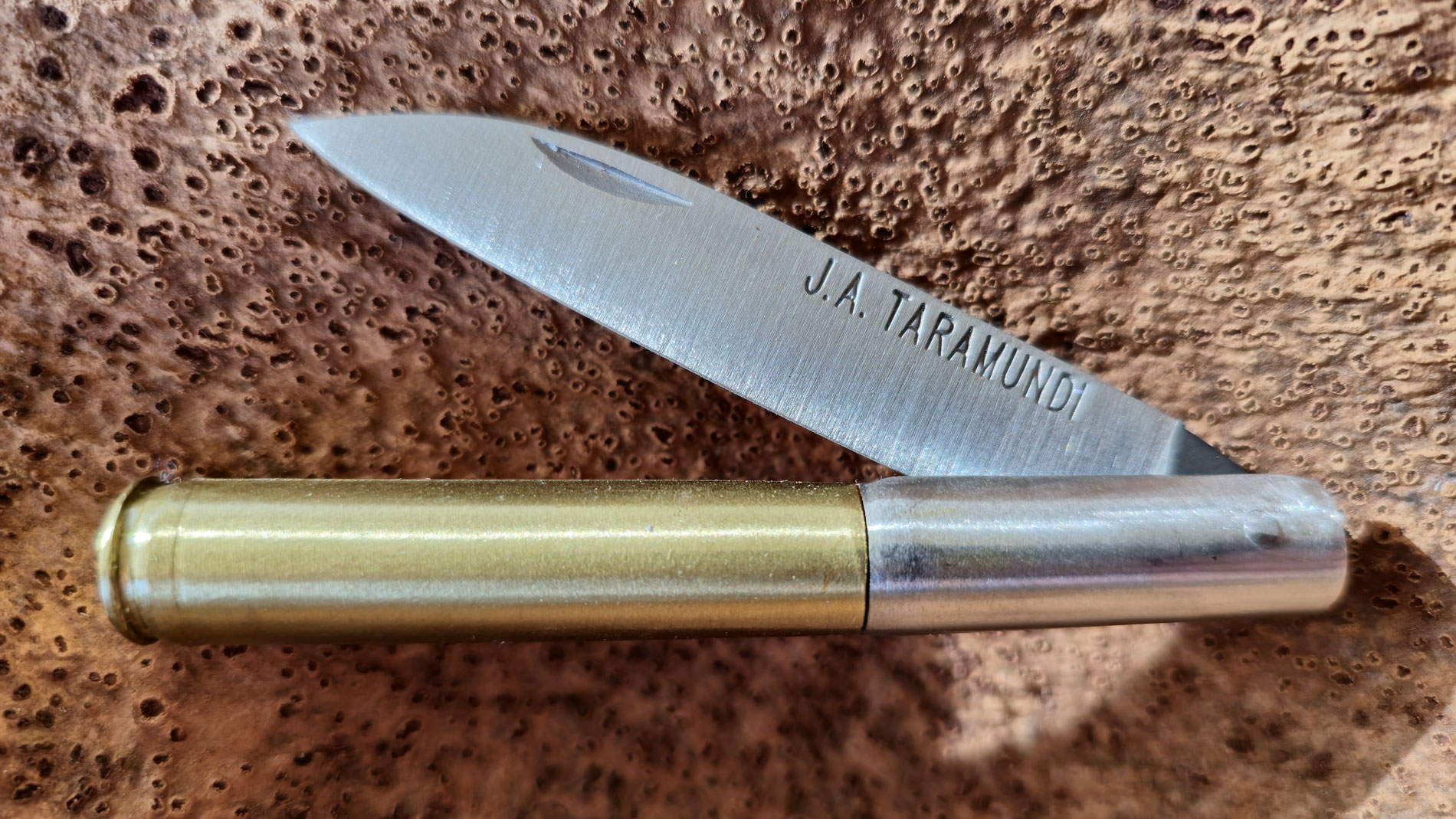 Navaja de casquillo real de bala, realizada artesanalmente por el Herrero de Vegadeo. Tamaño hoja inox.: 7,5 cm grabada J.A. TARAMUNDI,