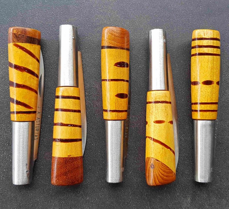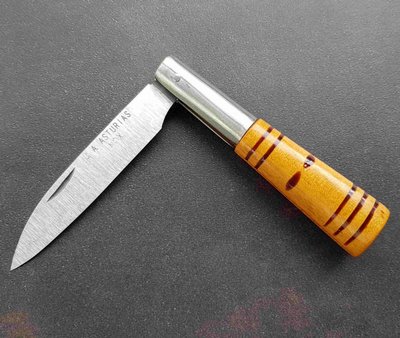 Navaja artesanal realizada por el Ferrero de Vegado, José Antonio Hoja de acero inox de aproximadamente 8x1,5 cm. Dimensiones cerrada: 9,5x2,2x1,5cm Abierta: 17,5 cm