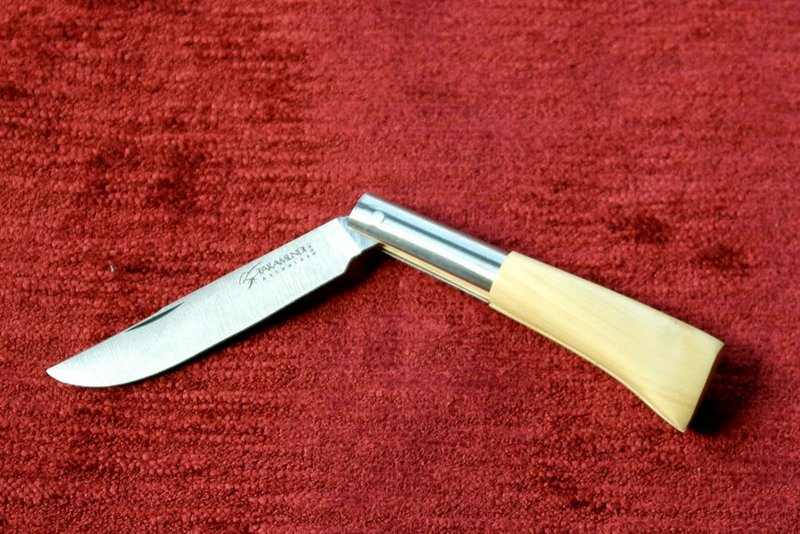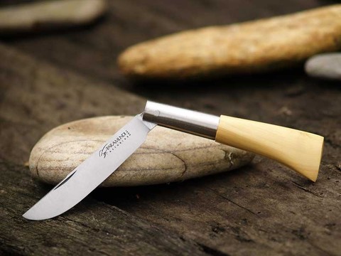 Navaja de Taramundi, fabricación artesanal, con mango de boj y hoja vuelta de acero inox de 7,5 cm. Dimensiones: 16,5 x 2,2 x 1,3cm.