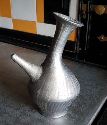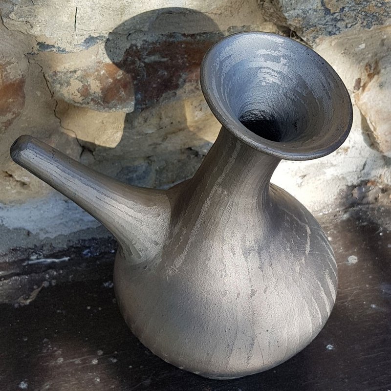 Porrón de Llamas de Mouro, pieza rara, pues el ceramista no suele hacer porrones, El color negro-gris metálico se debe a la arzilla de la zona y al método de cocción que incorpora el humo del horno en la cerámica, cerámica de extraordinaria dureza. Dimensiones aproximadas: 19x26x13,5 cm. ancho x alto x fondo.