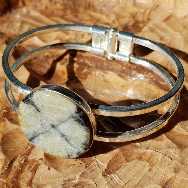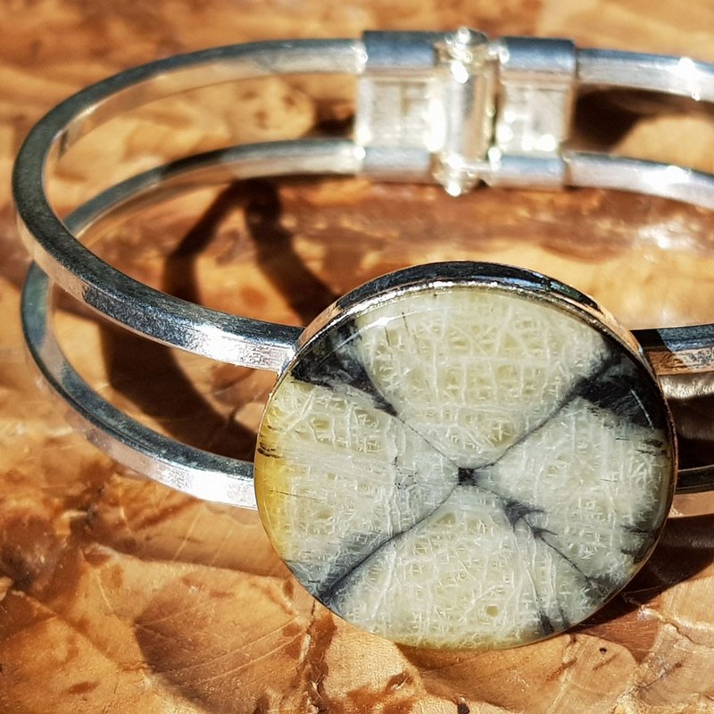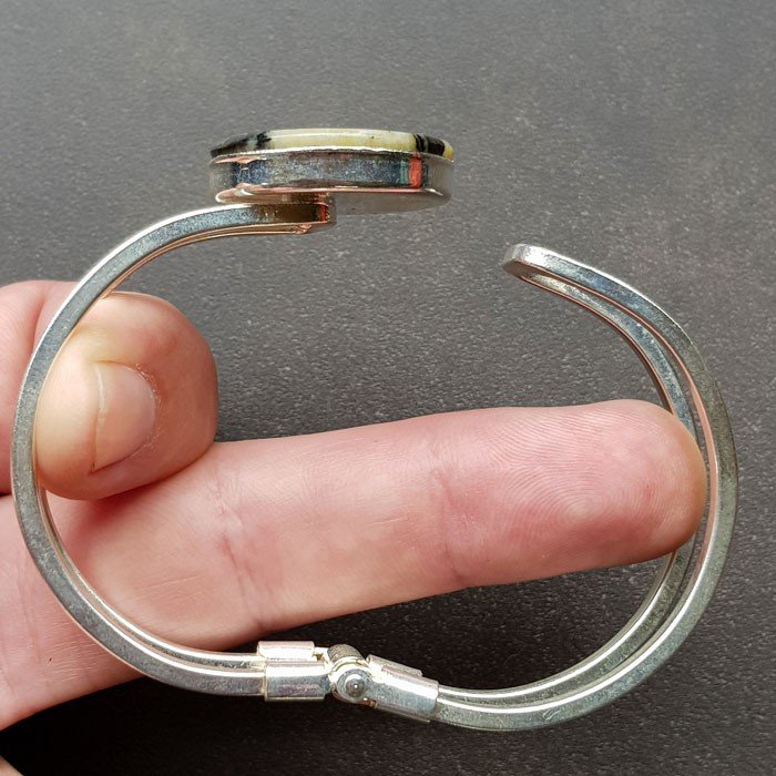 Pulsera metálica color plata con piedra de quiastolita. Medidas interiores 6x4,4 cm. exteriores 6,5x5,5 cm. Diámetro de la quiastolita 2,5 cm. Apertura y cierre muy cómoda por muelle.